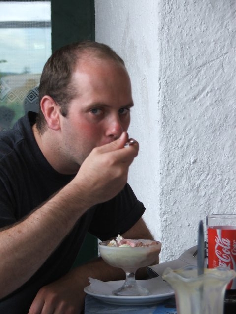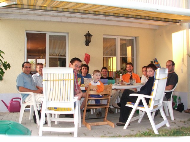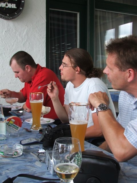 Nun ging es ins Nachbardorf, zum Eisessen resp. Biertrinken. Ich fuhr bei Remos Frau im B4 Avant (NG) mit. Wohlig-heimische Klänge, zumal der Motor ein Zwilling meines AAR ist. Beim Eisessen war nun das erste Mal Gelegenheit, in Ruhe ein paar Fotos von den Teilnehmern zu machen:
