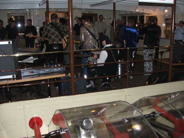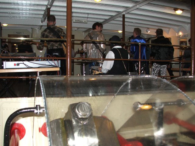 ... während andere sich an der Band auf dem Mitteldeck vergnügten. Im Vordergrund sind drei Plexiglas-Schaukästen erkennbar, in denen man jeweils ein Lager der Kurbelwelle des Dampfers bewundern konnte: