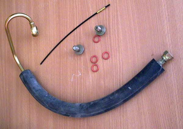 Neuer Druckschlauch mit nötigem Zubehör ( 4 Dichtungen, großer Druckschlauch, kleiner Dehnschlauch (das dünne Kunststoffröhrchen mit dem Haltkragen), Schraube SP (die mit dem Sieb), Schraube DS(die mit dem Loch, hat das Sieb seitlich)):