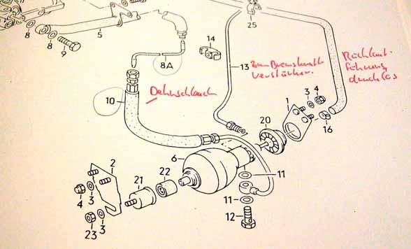 Der Dehnschlauch dient zur Dämpfung harter Pumpstöße. Nach mind. 15 Jahren wird er porös (siehe Bild). Die Kapilare der Pumpe sowie die Filter können sich durch losgelöste Partikel zusetzten, was einen steigenden Systemdruck nach sich zieht. Dadurch werden die Blindstopfen der Servopumpe undicht. Um also einen SP - Schaden vorzeitung zu vermeiden, sollte der Schlauch ersetzt werden.