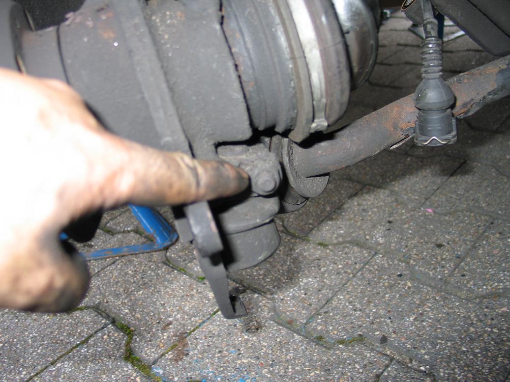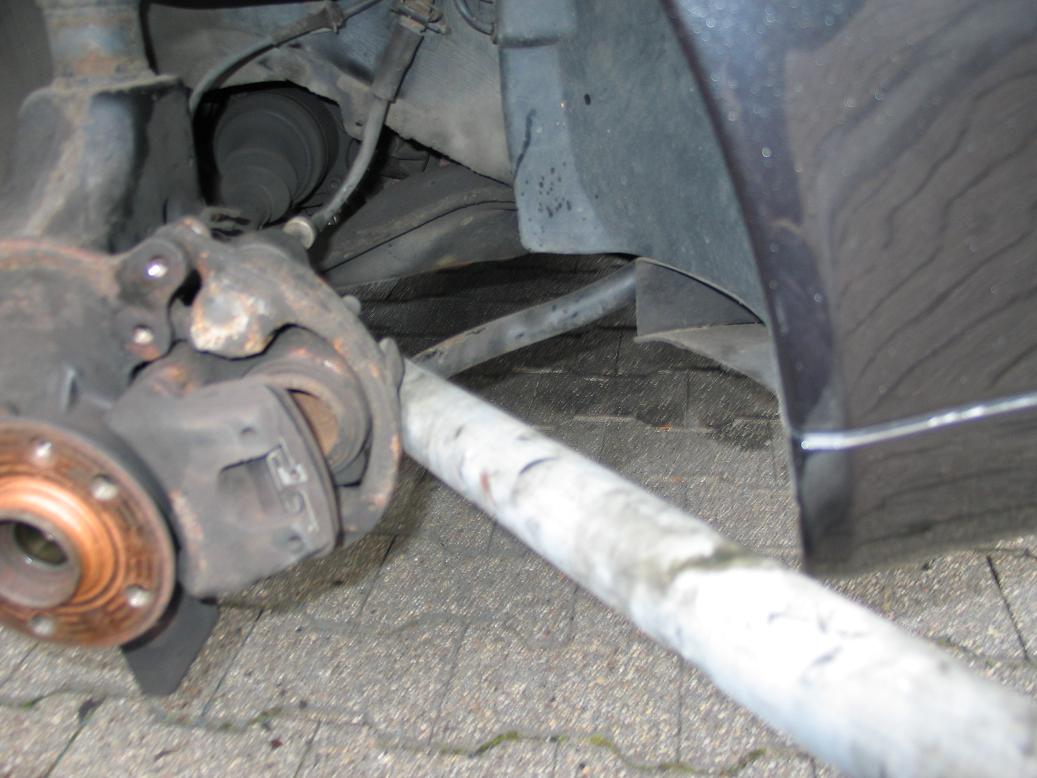 - Nun kommt wieder mein langes Rohr zum Einsatz. Einfach zwischen Stabilisator und Hilfsrahmen ansetzen, kurz nach unten drücken und schon ist das Federbein frei.