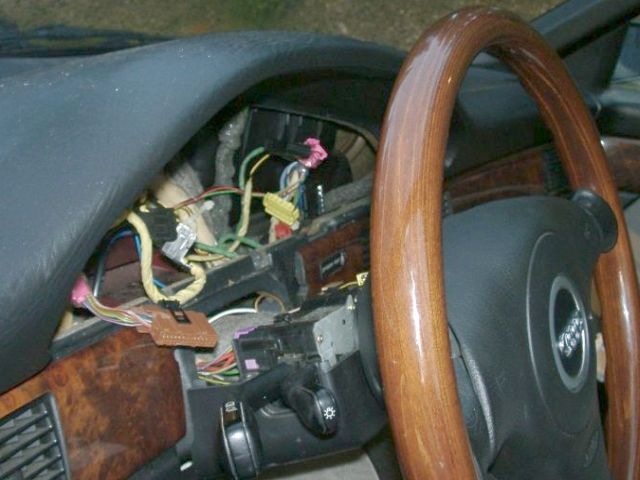 - Dann sollte das KI etwas nach rechts verschoben werden und gleichzeitig etwas vom Armaturenbrett entfernt werden. Jetzt kann man die dahinter befindlichen Stecker sehen. Diese werden der Reihe nach abgezogen, wobei bei dem grossen brauen und grossen schwarzen zunächst Halteklammern in der Mitte des Steckers hochgehebelt werden müssen.