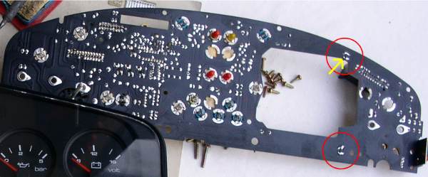 Hier sieht man die Platine, das Loch ist der Ausschnitt für den Tacho und in den roten Kreisen die kritischen Lötstellen. Der gelbe Pfeil zeigt die Masseverbindung zwischen rechtem (vom Stecker) und linken Teil (Lämpchen) der Platine. Wenn beim Blinken z.B. alle Lampen ein wenig aufleuchten, ist wohl ein Bruch an dieser Stelle. Diese Verbindung gut nachlöten und möglichst nicht mehr belasten (knicken o.ä.).