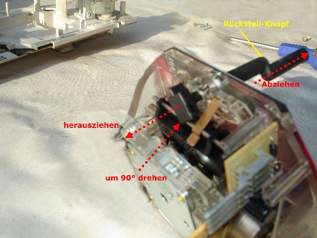 - Rückstell-Knopf des Tages-KM-Zählers entfernen (Vorderteil nach vorn abziehen, Hinterteil durch Drehung von der Welle lösen und rausziehen) *(BILD_007)*