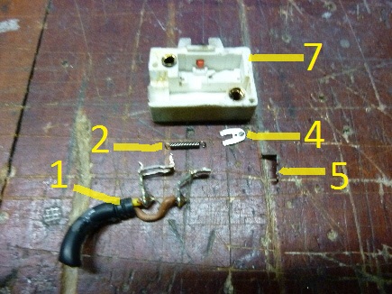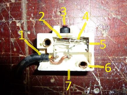 In nicht gedrückter Stellung liegt das Klappdingens(4) am Anschlag(5) an (kein Durchgang). Wenn man oben auf den Betätigungsknopf(3) drückt, drückt ein Stift auf die Feder(2) die mit dem Kabelkontakt(1) und dem Klappdingens(3) verbunden ist, das Klappdinges(3) wird mit einem Klick auf den zweiten Kabelkontakt(1) gedrückt. Der Schalter hat Durchgang.