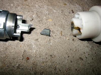 - Wenn der Zündschlüssel leer durchdreht und nichts passiert, ist die Nase am hinteren Ende des Zündschlosses gebrochen, die den Zündschloss-Schalter bedient (der sog. Zündschlossschalter-Mitnehmer). Mit etwas Glück ist jedoch noch so viel Rest vom Mitnehmer erhalten, dass man ihn wieder in eine rechteckige Form schleifen kann, nur dass er dann kürzer als vorher ist. Da man aber auch den Zündschloss-Schalter problemlos bis zu ca. 8 mm abschleifen kann (genug Material vorhanden!), kann auch ein verkürzter Mitnehmer wieder greifen!