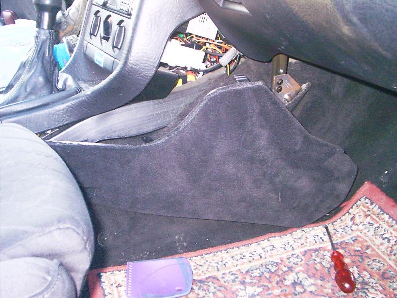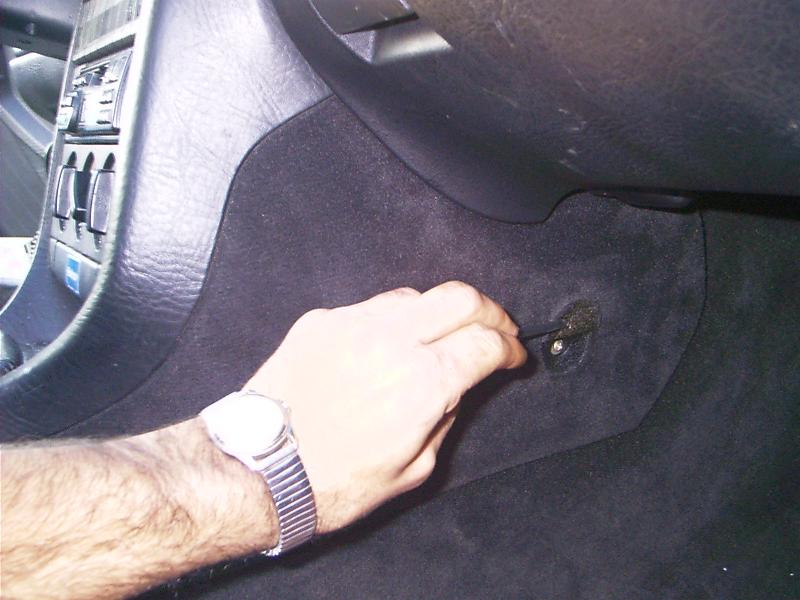 ...da ist der Teppich halbkreisförmig ca. 1 Euro-Stück - groß eingeschnitten und mit Doppelklebeband wieder verklebt. Schraube raus und dann die Abdeckung in Fahrtrichtung vor- und runterziehen,