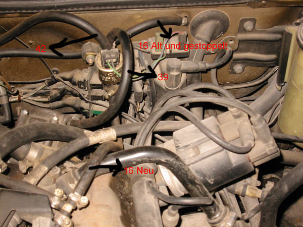 1. Also den Schlauch (im Bild mit 16 alt gekennzeichnet) vom unteren Anschluß des N75 abziehen und verschließen. (Sieht auf dem Bild nicht so aus. Ist aber so.)