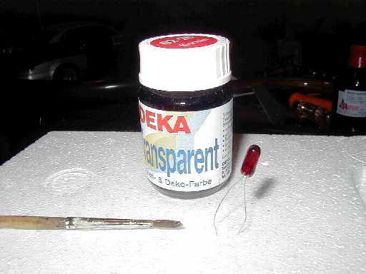 Falls passende, rot eingefärbte Lampen schwierig erhältlich sind, kann ersatzweise in einem Elektronikgeschäft eine klare Lampe (12 Volt, 10 x 4 mm) gekauft werden. In Geschäften für Modelleisenbahnen oder Bastlerbedarf ist Transparentfarbe erhältlich (z.B. DEKA Transparent, 02-20 Karmin). Diese muß sehr dick, am besten dreimal aufgetragen werden:%