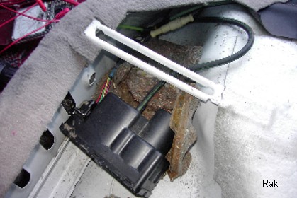 Unter der Rückbank in Fahrtrichtung rechts hinten, in Dämmstoff eingepackt.